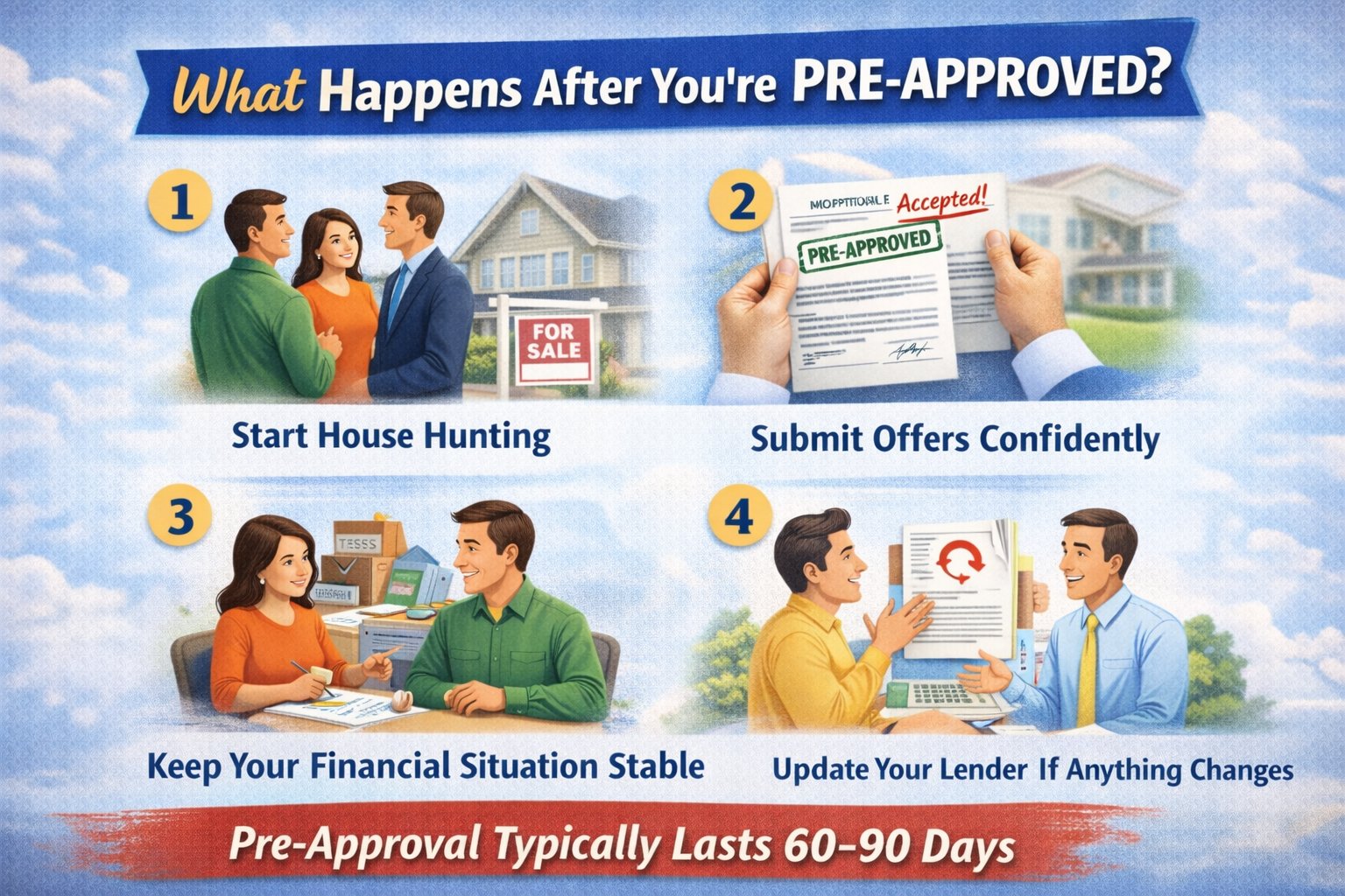 Pre-approvals typically last 60–90 days. If you don’t find a home in that timeframe, your lender may need to refresh your documents.